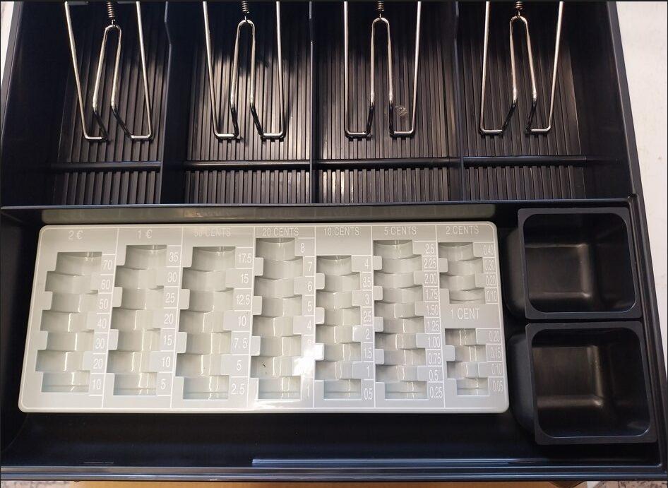 23. Predal Euro 4141BEE v črni barvi. Odpiranje elektronsko 24V RJ11 preko tiskalnika ali ročno na ključ. Predal ima štiri kovinska obtežilna držala za euro bankovce, sortirnik za euro kovance in dva premakljiva lončka na desni za odlaganje nesortiranih kovancev. V sortirnik za kovance gre 35 kovancev za 2 eur, 35 kovancev po 1 euro, 35 kovancev za pol eura, 40 kovancev za 20 centov, 40 kovancev za 10 centov, 50 kovancev za 5 c, ter 20 kovancev za 1 in 20 kovancev za 2 cent. Mere 41 cm širina, 41 globina, 10 cm višina. Na zalogi, tudi vsi posamezni deli, sortirnik, vložek komplet, skodelice za drobiž. Cena 77 eur+ddv