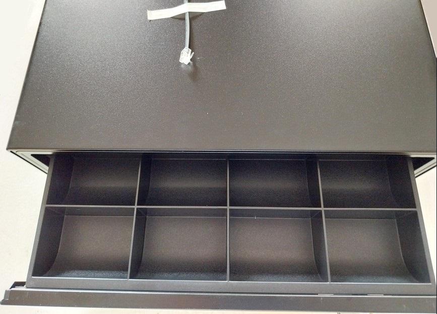 11. Predal Euro 3540 elektronsko odpiranje RJ 11 preko tiskalnika in ročno na ključ. Dimenzije 35 cm širina x 40 cm globina x 10 cm višina. Teža 6 kg. 8 oddelkov za kovance, 4je oddelki za bankovce. Pod vložkom je prostor za pos listke ali podobno. Barva črna. Vložek iz močne trdne plastike. Pločevina debeline 1-2mm, kovinski obtežilniki za bankovce, made in Europa. Na voljo tudi vsi posamezni deli: samo predalnik, samo vložek, samo sortirnik bankovcev, kovancev, po naročilu tudi pokrov vložka za izmensko delo. Cena 65 eur+ddv