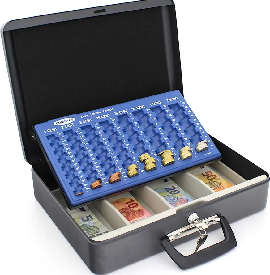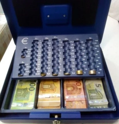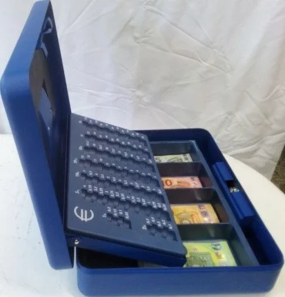 19. Predalnik Euro 4141E na zalogi v beli Beige barvi. Vsebuje vložek s 4 oddelki za bankovce in banjico za 8 vrst kovancev. Spredaj dve reži za čeke, izpiske ali podobno. Odpiranje na ključ ali elektronsko RJ11. Velikost predalčkov za kovance in za bankovce se da spreminjati. Držala bankovcev so kovinska. Dimenzije: 41cm šir x 41,5cm globina x 11,5 cm višina. Na voljo tudi vsi posamezni deli: samo predalnik, samo vložek, samo sortirnik bankovcev, kovancev, skodelice za drobiž… Cena 71 eur+ddv