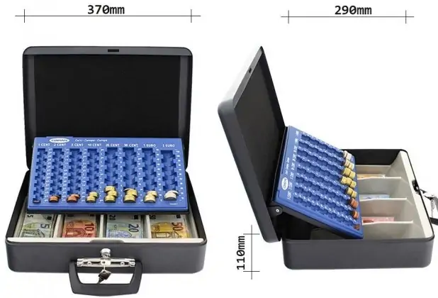 Širina 40 cm, globina 33,2 cm, višina 6,2 cm. Lahko tudi za namizno uporabo ali za v predal od pisalne mize. Širina predalčkov za bankovce se da prilagajat, za kovance ne. Možno je dokupiti originalni pokrov z zatiči in ključavnico, za izmensko delo z doplačilom + 26 eur + ddv. Cena kompleta: vložek + kovinski pokrov + 2 ključa: 61 eur+ddv.